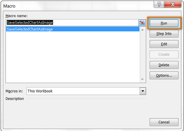 Mở thẻ Developer lần nữa và nhấp vào biểu tượng Macro. Một danh sách các macro trong bảng tính được mở ra. Tất cả những gì bạn cần làm là chọn SaveSelectedChartAsImage và nhấn nút Run.
