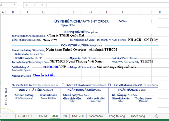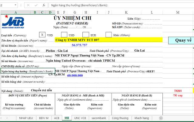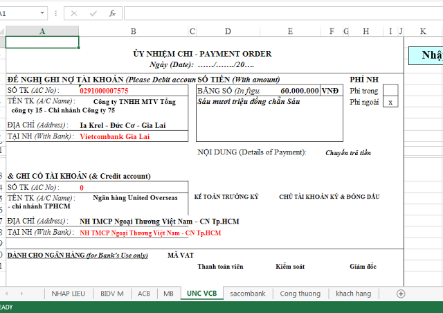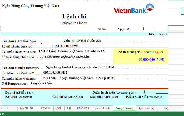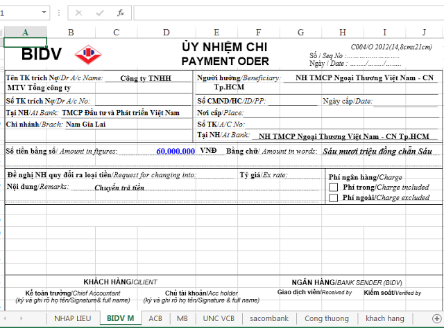 Excel in ủy nhiệm chi BIDV, ACB, MB, VB, Sacombank, VietinBank