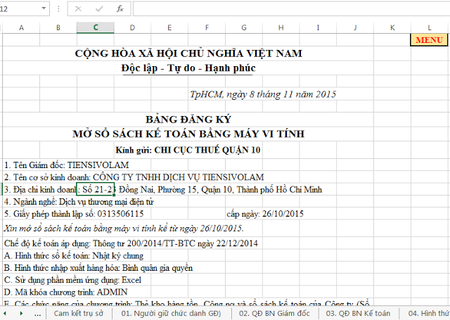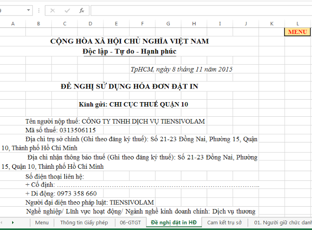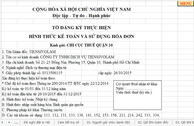 Mẫu Excel đăng ký thuế ban đầu, đặt in hóa đơn